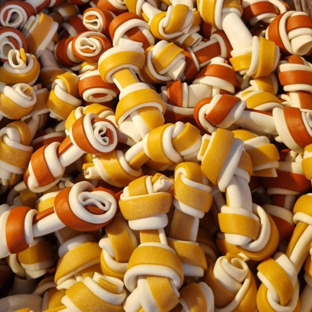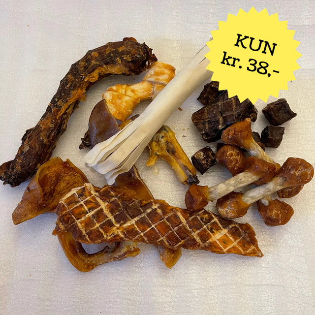 Vi har lavet to spændende poser, fyldt med tyggeting til hundevenner. Alle lækkerier er fra EU. Poserne findes i to størrelser til kr. 98,- eller kr. 149,-