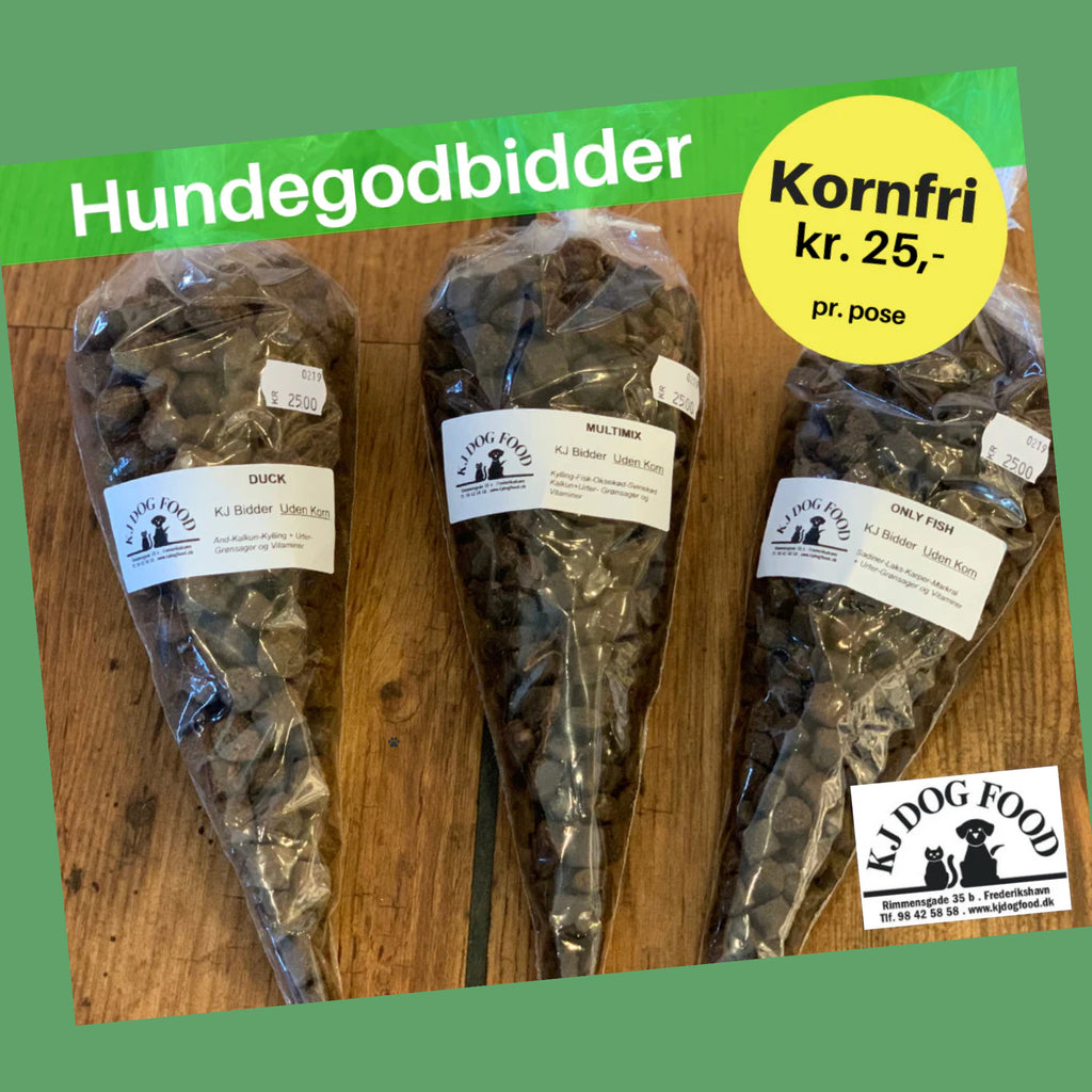 Vores populære KJ BIDDER er bløde og lækre godbidder, UDEN KORN. Hver pose indeholder ca. 350 gram og findes i 6 spændende smagsvarianter: